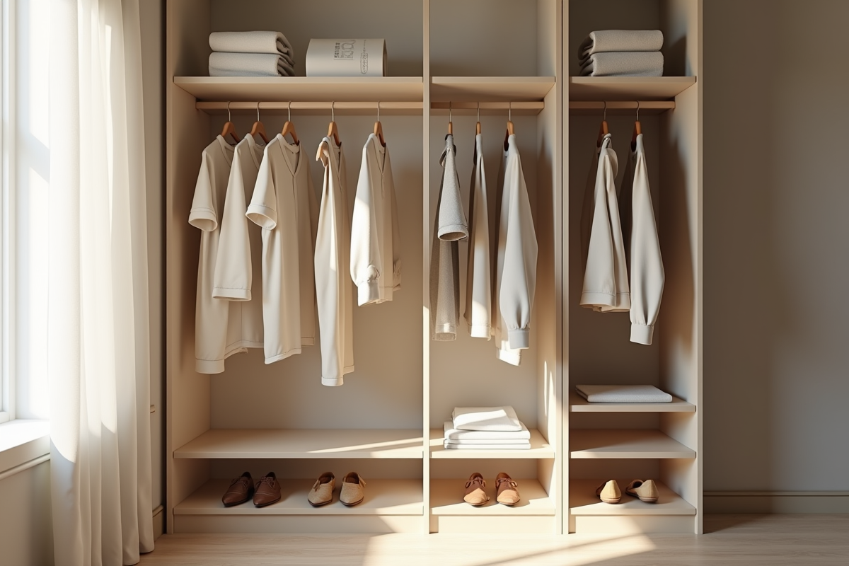 L’organisation du dressing fait toute la différence. Choisissez des cintres uniformes, regroupez par couleur ou par catégorie. Rangez les vêtements hors saison ailleurs pour gagner en clarté et en rapidité d’action. Ce nouvel ordre simplifie la prise de décision, limite le stress du matin, et met en avant les pièces qui comptent vraiment.